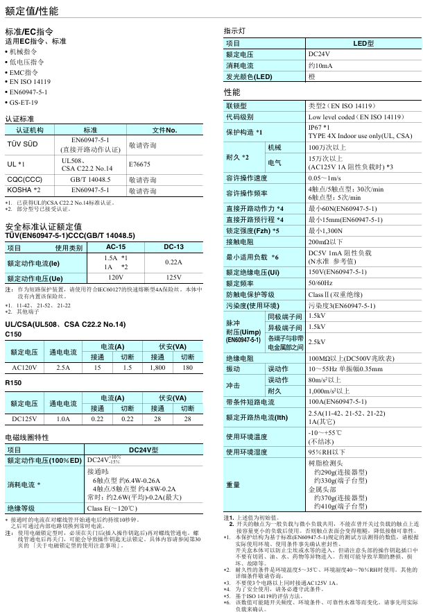电磁锁定用螺线管电流:4触点、5触点型实现0.2A、6触点型实现0.26A。