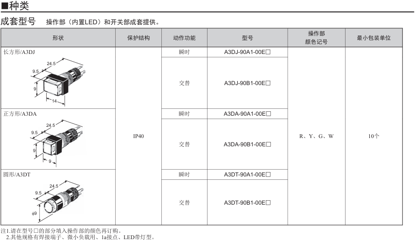 首页 欧姆龙 开关 按钮开关/显示灯 A3D带灯按钮开关(圆型φ8) A3D带灯按钮开关(圆型φ8) 柱体长18mm、圆型φ8系列 高亮度的均一表面发光。 圆形便于开孔。 形状小巧,操作感好。 有关详细信息,请参阅产品样本及其他相关文件:A3D 产品样本、开关选型指南 分类: 按钮开关/显示灯 品牌: 欧姆龙 描述 用户评价 (0) 产品信息 评价 目前还没有评价 成为第一个“A3D带灯按钮开关(圆型φ8)” 的评价者取消回复您的邮箱地址不会被公开。 必填项已用 * 标注您的评级 * 评价… 完美 很好 普通 还行 极差 名称 *邮箱 *您的评价 * 在此浏览器中保存我的显示名称、邮箱地址和网站地址,以便下次评论时使用。 提交 相关产品 A3P带灯按钮开关(正方形) 按钮开关/显示灯 A165K钥匙型选择开关(可拆卸) (圆型φ16) 按钮开关/显示灯 A3C按钮开关(带灯·不带灯)(圆型φ12) 按钮开关/显示灯 A3A小型按钮开关(小型方体型) 按钮开关/显示灯