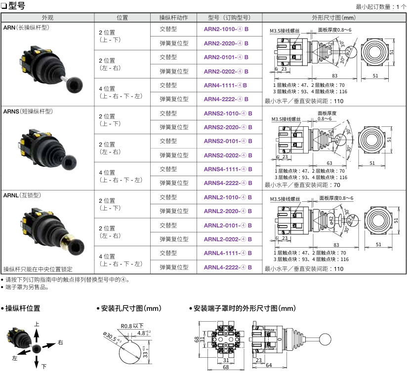 有关详细信息,请参阅产品样本及其他相关文件:ARN/ARNS 型 摇杆开关 / CS 系列 凸轮开关