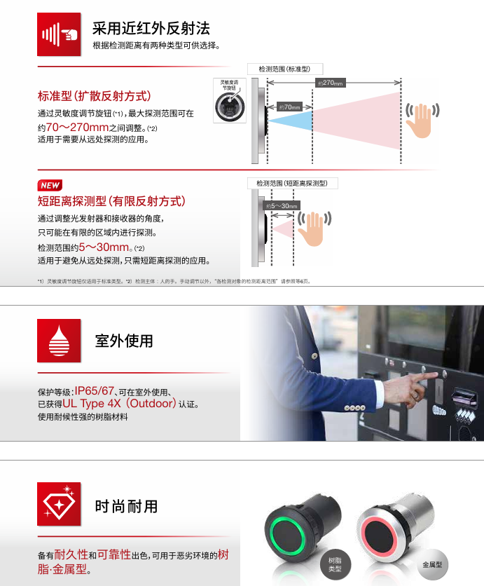 - 采用了近红外线反射方式,检测距离最大可调整至270mm。(检测对象:人手)(手以外,“各检测对象的检测距离范围”请参照第6 页)