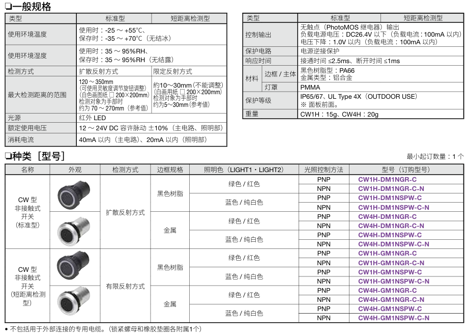 有关详细信息,请参阅产品样本及其他相关文件:平面镶嵌框型非接触式开关 CW1H/CW4H型