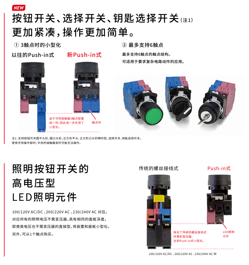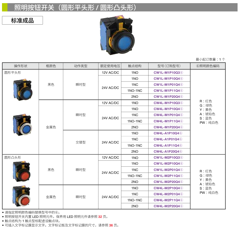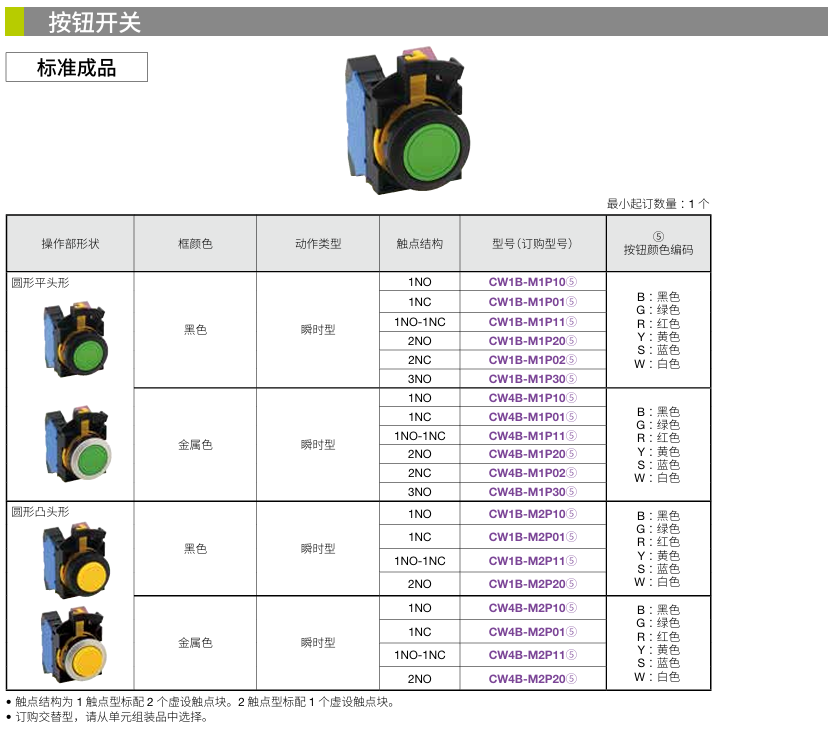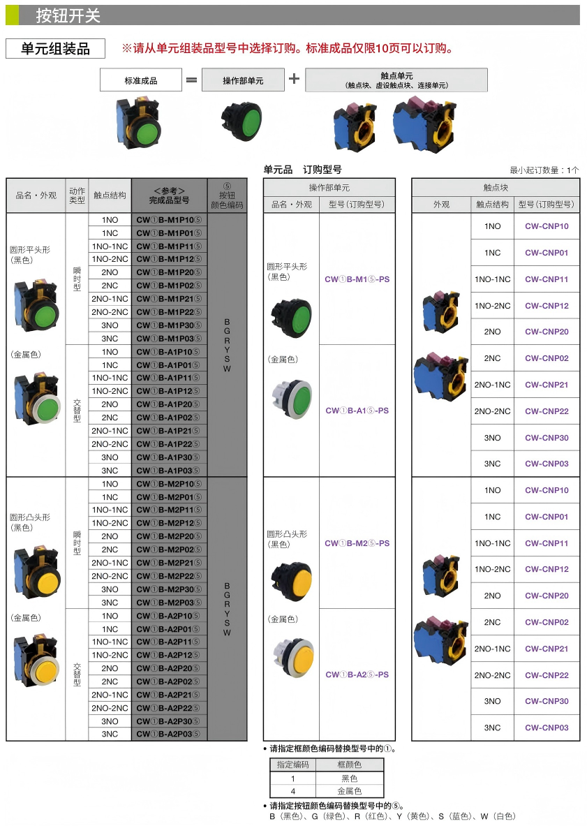 首页 和泉 人机界面 按钮开关 按钮开关·指示灯 CW系列(Push-in端子型) CW系列(Push-in端子型) 薄型设计与Push-in式的智能操作,ø22平面镶嵌框型 10A IP65 1个LED6种颜色 在急需改变照明颜色时,只需购买灯罩就可轻松改变颜色。不仅便于颜色变更·库存数消减,也利于环境保护。 新LED可视性提高,ISO3864-4安全颜色对应 接线简单,高效率作业 接线端子部IP20手指安全保护结构 有关详细信息,请参阅产品样本及其他相关文件:平面镶嵌框型 ø22 Push-in 式 控制元器件 CW系列 分类: 按钮开关·指示灯 品牌: 和泉 描述 用户评价 (0) 产品特点 产品信息 评价 目前还没有评价 成为第一个“CW系列(Push-in端子型)” 的评价者取消回复您的邮箱地址不会被公开。 必填项已用 * 标注您的评级 * 评价… 完美 很好 普通 还行 极差 名称 *邮箱 *您的评价 * 在此浏览器中保存我的显示名称、邮箱地址和网站地址,以便下次评论时使用。 提交 相关产品 HW系列(Push-in端子型) 按钮开关·指示灯 平面镶嵌框型CW系列 CW1H/CW4H非接触式开关 按钮开关·指示灯 YW系列 控制元器件 按钮开关·指示灯 IA系列按钮开关 按钮开关·指示灯