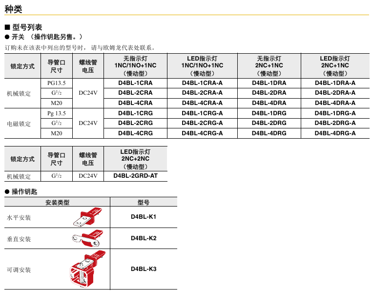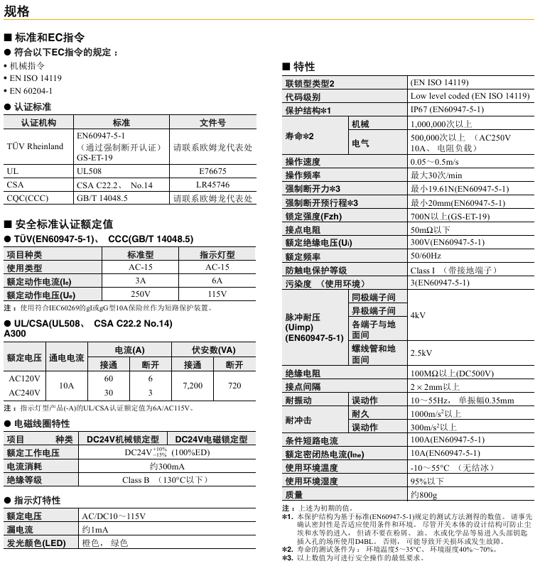 首页 欧姆龙 安全产品 安全门开关 D4BL 电磁锁定安全门开关 D4BL 电磁锁定安全门开关 铝铸件本体 锁定强度700N 辅助释放钥匙确保轻松维护,在断电的情况下能够将门解锁。 铝铸件本体组装了符合IP67、UL、CSA TYPE6P、13保护构造的开关盒。 配备了水平和垂直方向的导管口。 可提供适用于监控的醒目指示灯型和适用于旋转门的可调操作钥匙型。 开关头的安装方向可以变换,可以从四个方向插入操作钥匙 有关详细信息,请参阅产品样本及其他相关文件:D4BL 产品规格书、安全元器件 安全应用指南 分类: 安全门开关 品牌: 欧姆龙 描述 用户评价 (0) 产品信息 评价 目前还没有评价 成为第一个“D4BL 电磁锁定安全门开关” 的评价者取消回复您的邮箱地址不会被公开。 必填项已用 * 标注您的评级 * 评价… 完美 很好 普通 还行 极差 名称 *邮箱 *您的评价 * 在此浏览器中保存我的显示名称、邮箱地址和网站地址,以便下次评论时使用。 提交 相关产品 小型电磁锁定安全门开关/滑动钥匙单元 D4SL-N / D4SL-NSK10-LK□ 安全门开关 D40A-2 非接触式安全门开关 安全门开关