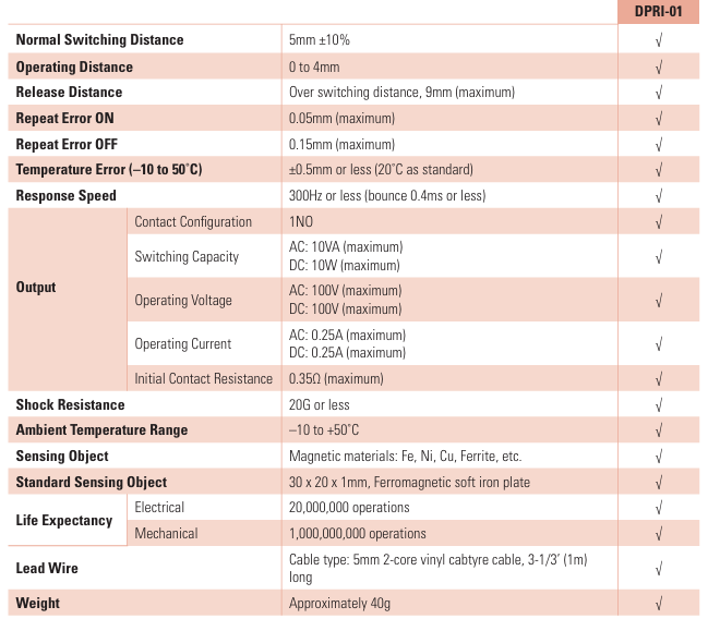 首页 和泉 自动化 传感器 接近开关 DPRI型(磁性)接近开关 DPRI型(磁性)接近开关 磁簧感测器和磁铁组合成一体的磁性近接感测器。无需接触即可检出外部磁性体(铁,钴,镍,铁氧体等)。完全密封的内部结构,使用寿命长,可靠性能高。 可密集安装,无需驱动电源,小型、轻量、可安装在狭小空间 有关详细信息,请参阅产品样本及其他相关文件:Catalog、DPRI型(磁性)接近开关 分类: 接近开关 品牌: 和泉 描述 用户评价 (0) 产品信息 评价 目前还没有评价 成为第一个“DPRI型(磁性)接近开关” 的评价者取消回复您的邮箱地址不会被公开。 必填项已用 * 标注您的评级 * 评价… 完美 很好 普通 还行 极差 名称 *邮箱 *您的评价 * 在此浏览器中保存我的显示名称、邮箱地址和网站地址,以便下次评论时使用。 提交
