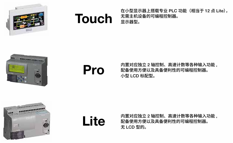 揽括各种常用功能、I/O 一体型高功率可编程控制器。Touch、Pro、Lite 3种类型可自由对应各种应用,有助于省空间· 省接线。