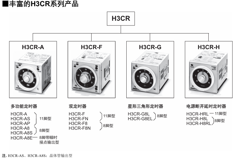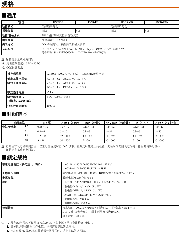 有关详细信息,请参阅产品样本及其他相关文件:H3CR 产品规格书、H3CR-F/-G/-H 产品样本、H3CR-□ 注意事项