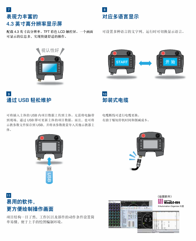 - 通过USB存储器轻松维护,支持可拆卸电缆