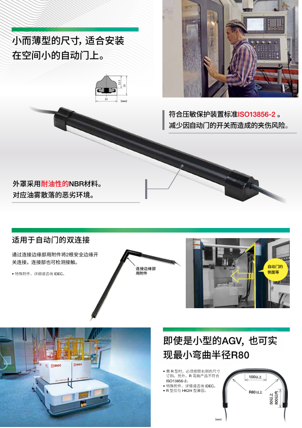 有助于机床自动门和小型自动导引车安全措施的小型安全边缘开关