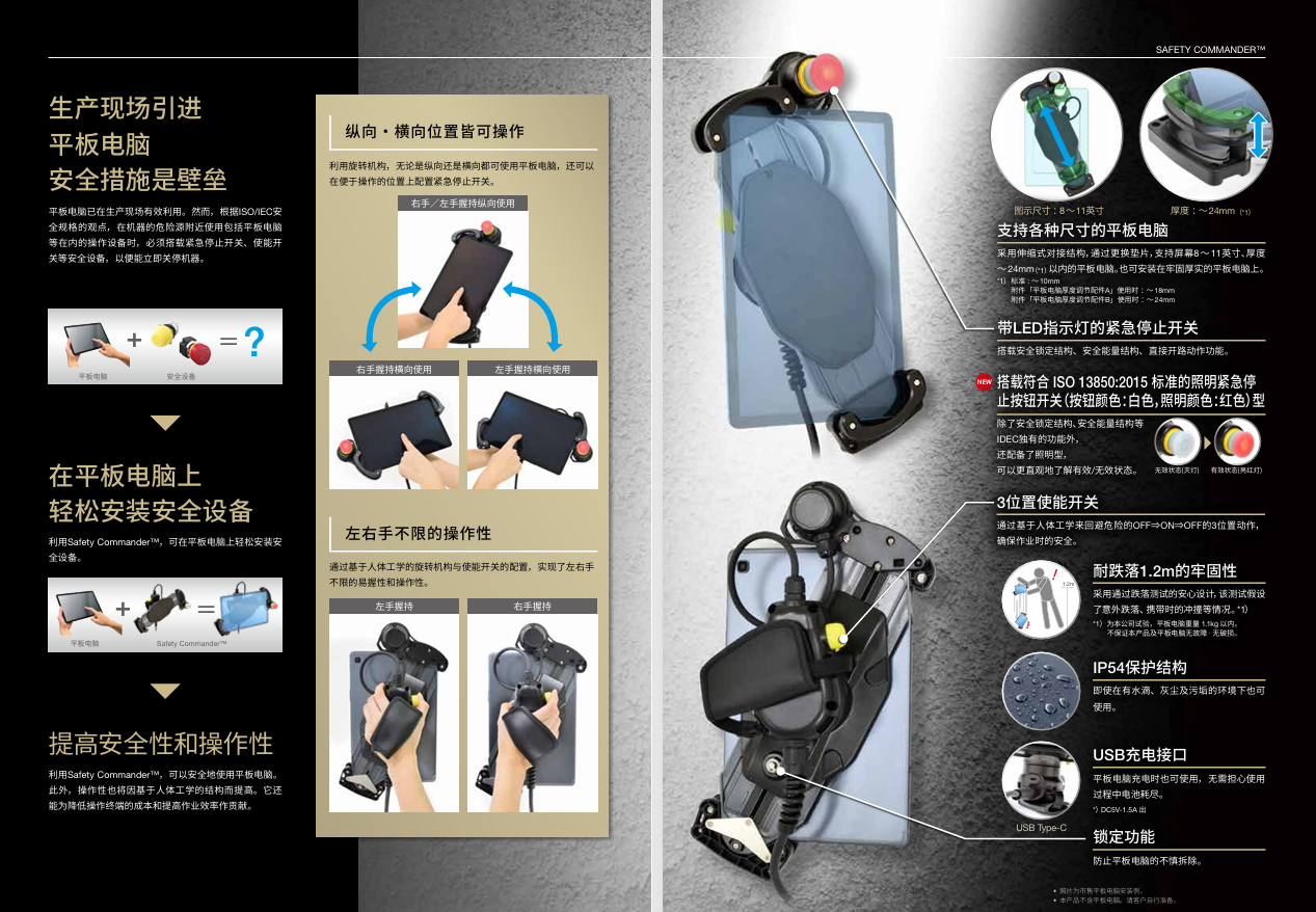 首页 和泉 安全防爆 安全设备 Safety Commander HT3P型 Safety Commander™ HT3P型 Safety Commander™ 为生产现场的平板电脑添加安全功能 关键锁定装置,确保平板电脑在设备中的安全。 坚固且符合人体工程学的手柄和带子,适合左右手用户使用。 专利设计,能够将平板旋转至用户最方便的位置。 一个带LED指示灯的硬接线急停按钮。 一个硬接线三位使能开关。 用于平板充电的USB Type-C端口。 IP54防护等级,跌落抗摔测试高度为1.2米。 有关详细信息,请参阅产品样本及其他相关文件:HT3P型 Safety Commander™ 分类: Safety Commander 品牌: 和泉 描述 用户评价 (0) 产品特点 产品信息 评价 目前还没有评价 成为第一个“HT3P型 Safety Commander™” 的评价者取消回复您的邮箱地址不会被公开。 必填项已用 * 标注您的评级 * 评价… 完美 很好 普通 还行 极差 名称 *邮箱 *您的评价 * 在此浏览器中保存我的显示名称、邮箱地址和网站地址,以便下次评论时使用。 提交 相关产品 HT4P Safety Commander™ Safety Commander