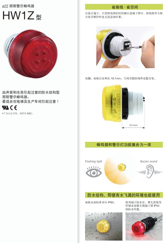 - ø22mm 照明/非照明警示蜂鸣器 IP65保护等级,短胴,空间受限的场所也能安装。