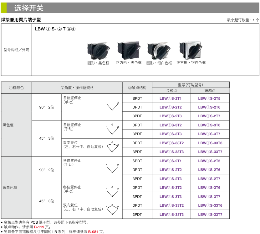 - 按钮开关、选择开关、钥匙选择开关具备最大3PDT 触点。