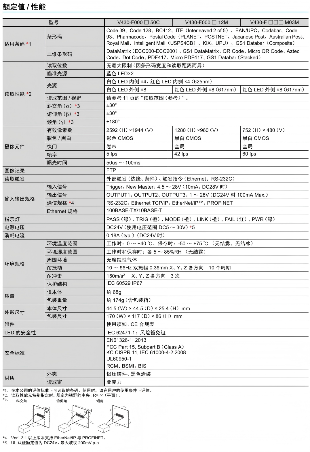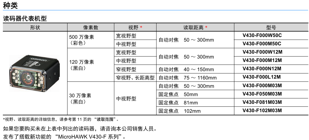有关详细信息,请参阅产品样本及其他相关文件:V430-F系列 产品样本、V430-F系列 产品规格书、读码器系列样本
