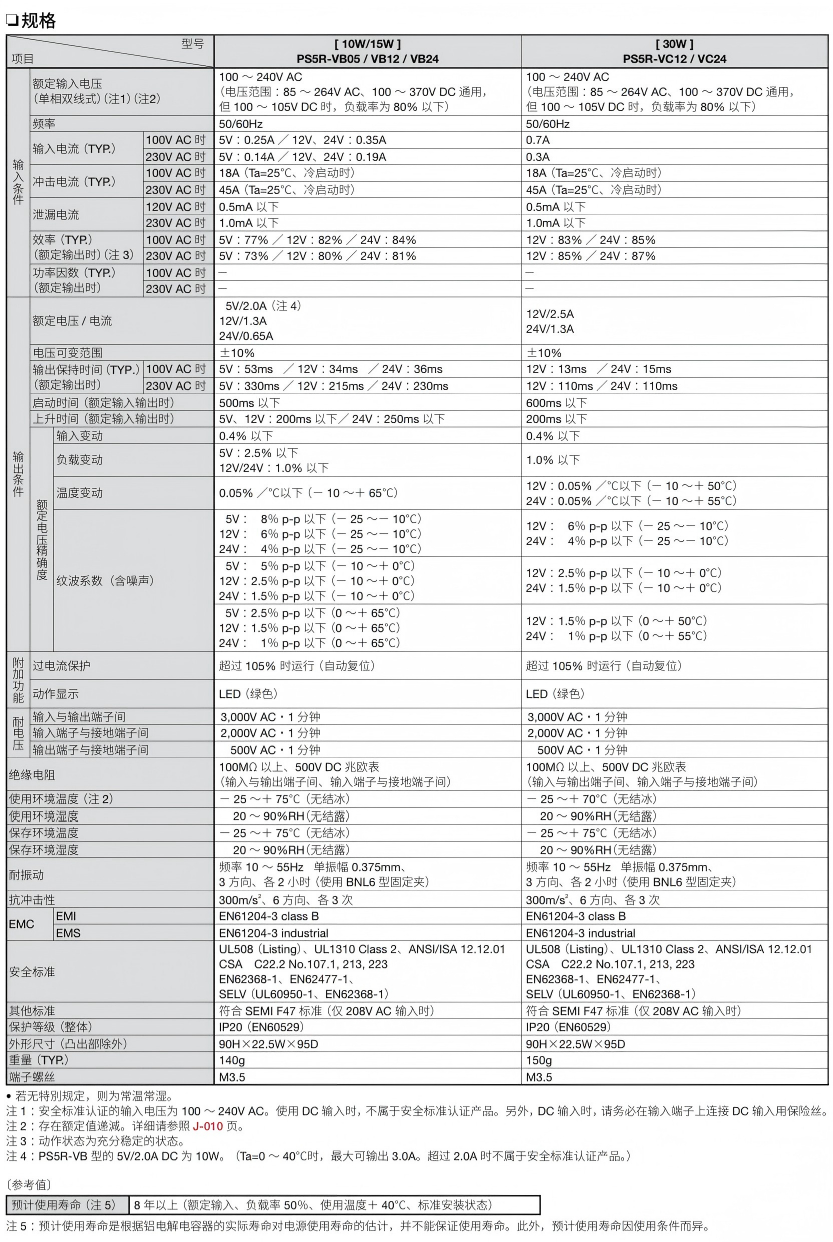 - 符合CE标准。(LVD、EMCD)UL(UL508,UL1310 Class 2(✽)、ANSI/ISA12.12.01)、c-UL(CSA C22.2 No.107.1,213,223(✽))TÜV SÜD(EN60950-1、EN50178)认证品。✽ 1:仅限PS5R-VB/VC/VD/VE 型。