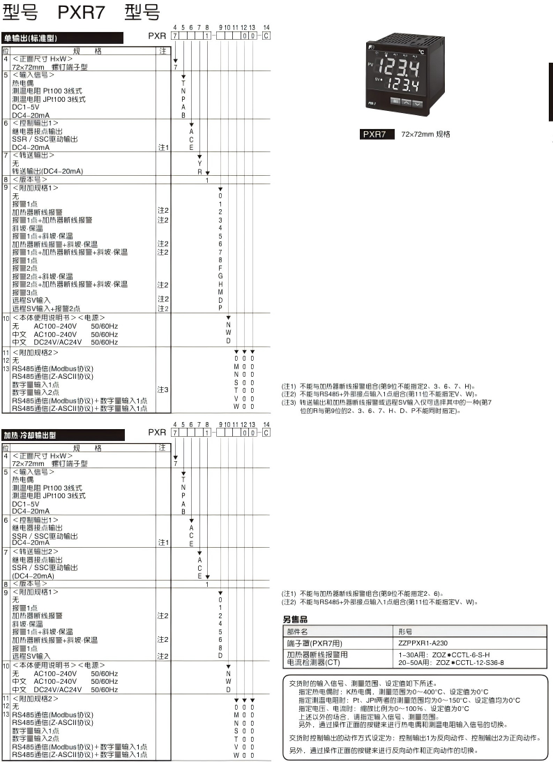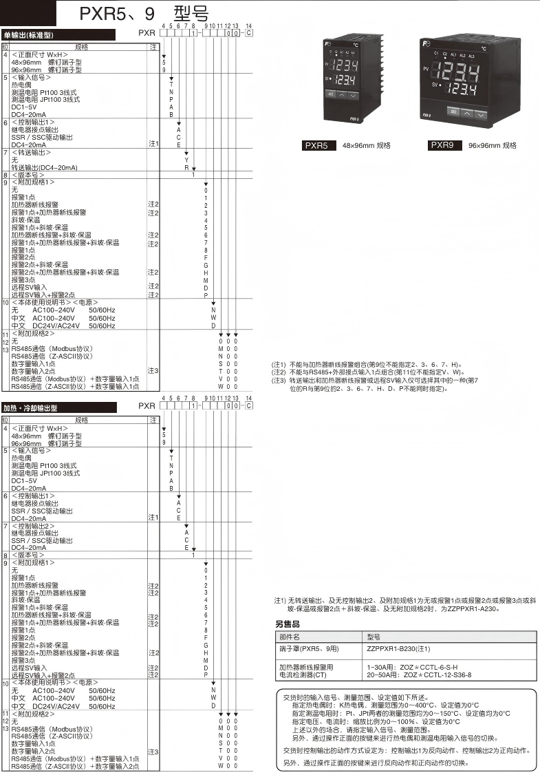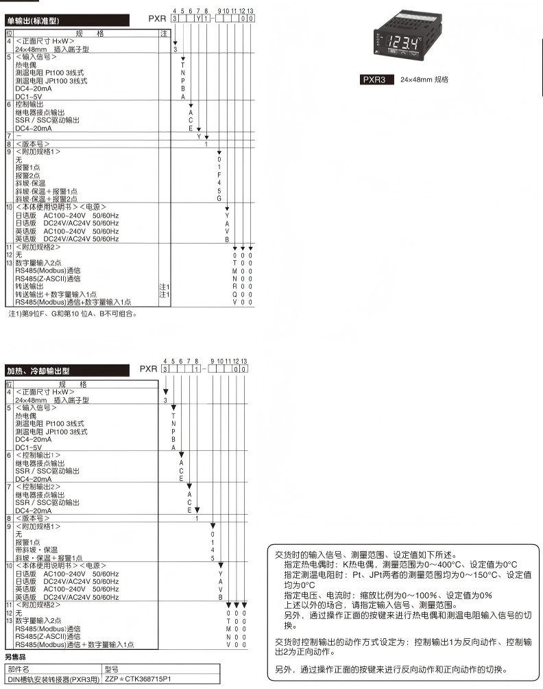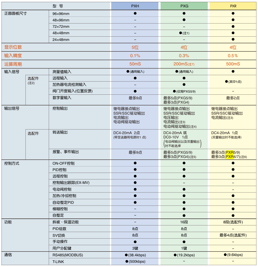 产品特点 更大〈大而醒目的LED显示〉 远距离的可视性超群! 文字高度 PXR3 PXR4 PXR5 PXR7 PXR9 PV显示 11mm 13mm 17mm 20mm SV显示 11mm 12mm 12mm 功能更多〈功能完备、选项丰富〉 标准装备 多种控制、整定功能 从简单的ON/OFF控制到模糊PID控制都能适应。 正面防水结构(NEMA4X、相当于IP66) 面板的正面可水洗。 选项功能 DC4~20mA转送输出 可向其它仪表转送PV(测量值)、SV(设定值)、MV(操作值) 8段斜坡-保温功能 借助设定值程序,可以用作简易的程序控制器。 RS485通信 可从MODBUS协议和Z-ASCⅡ(本公司独创)2者中选择 数字输入 通过外部开关等的操作,可选择SV(设定值)、执行各种事件。 加热、冷却控制 也可适应具有自加热性能的工序。 加热器断线报警 可防止装置的损伤于未然。 多种报警功能 也可将延时动作、励磁/非励磁切换、锁定功能组合使用。 更紧凑〈厚度尺寸小〉 为控制柜、装置的小型化、薄型化作出大贡献 产品信息 评价 目前还没有评价 成为第一个“PXR系列通用型温度调节器” 的评价者取消回复您的邮箱地址不会被公开。 必填项已用 * 标注您的评级 * 评价… 完美 很好 普通 还行 极差 名称 *邮箱 *您的评价 * 在此浏览器中保存我的显示名称、邮箱地址和网站地址,以便下次评论时使用。 提交