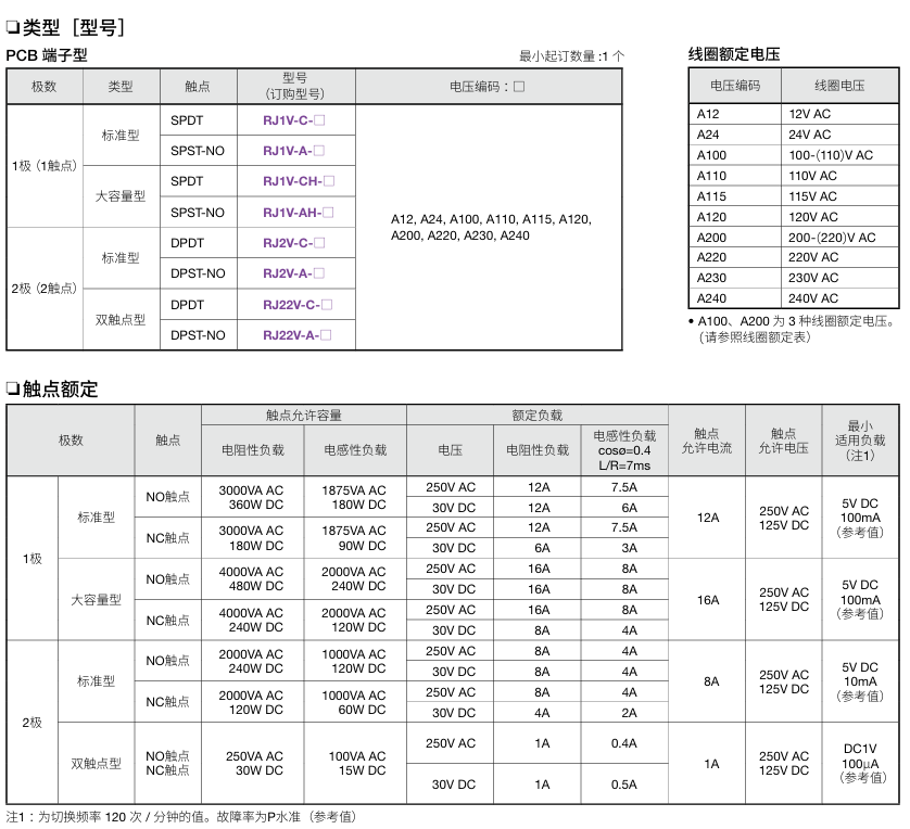 有关详细信息,请参阅产品样本及其他相关文件:RJ系列 薄型功率继电器(PCB端子型)