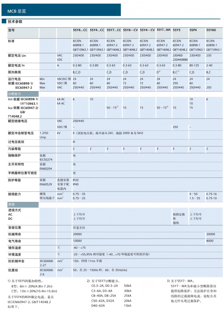 5SY小型断路器包括交流和直流系列,电流等级覆盖最小0.3A到最大80A,极数1极到4极以及1+N和3+N,脱扣曲线 B、C、D,分断能力最大可达50kA。