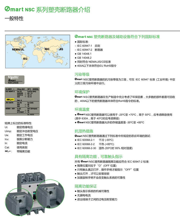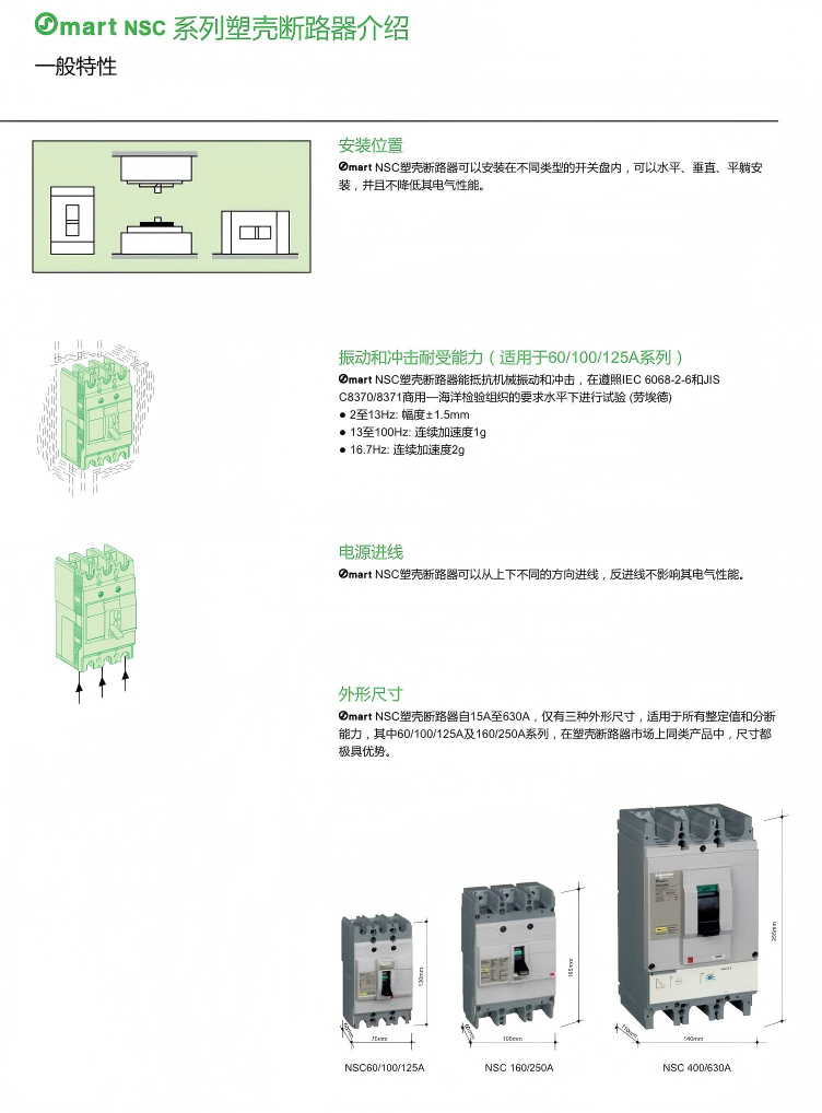 产品特性 作为机械设备进线总开关 额定电流:全系列15~630A 电压等级:550V(15~250A)、440V(250A~630A) 分断能力:E7.5KA、B10KA、S18KA、K35KA 脱扣单元:热磁式(配电保护)、单磁式(电动机保护) 极数:3P/4P 安装方式: 固定式安装方式,可水平,垂直,平躺安装,不影响电气性能环境温度:-25℃~+70℃,高于50℃时应考虑降容(630A下40℃应考虑降容) 产品信息 评价 目前还没有评价 成为第一个“Osmart NSC 塑壳断路器” 的评价者取消回复您的邮箱地址不会被公开。 必填项已用 * 标注您的评级 * 评价… 完美 很好 普通 还行 极差 名称 *邮箱 *您的评价 * 在此浏览器中保存我的显示名称、邮箱地址和网站地址,以便下次评论时使用。 提交