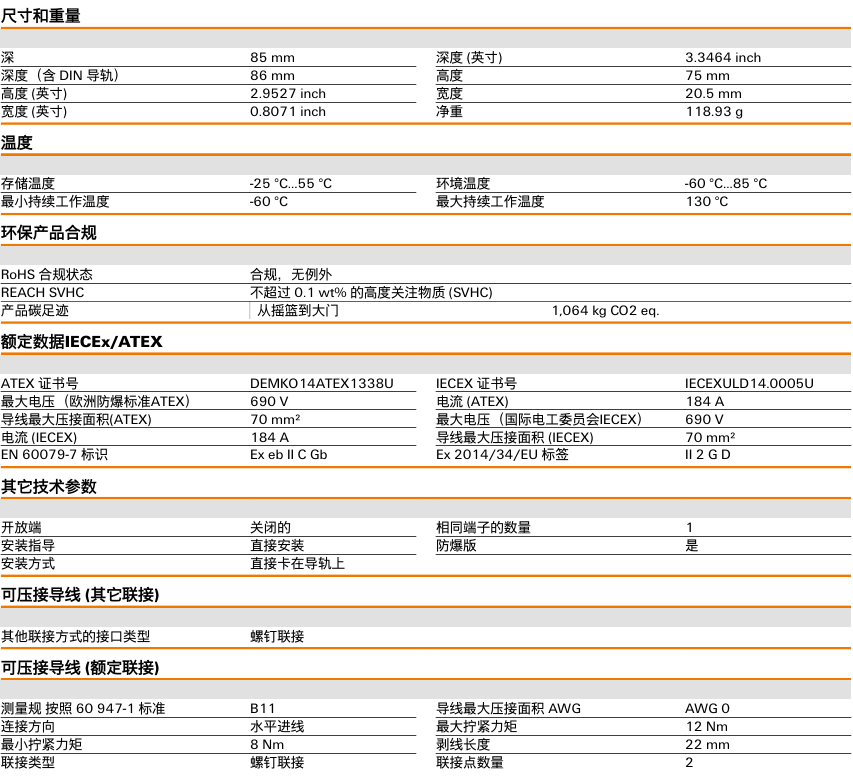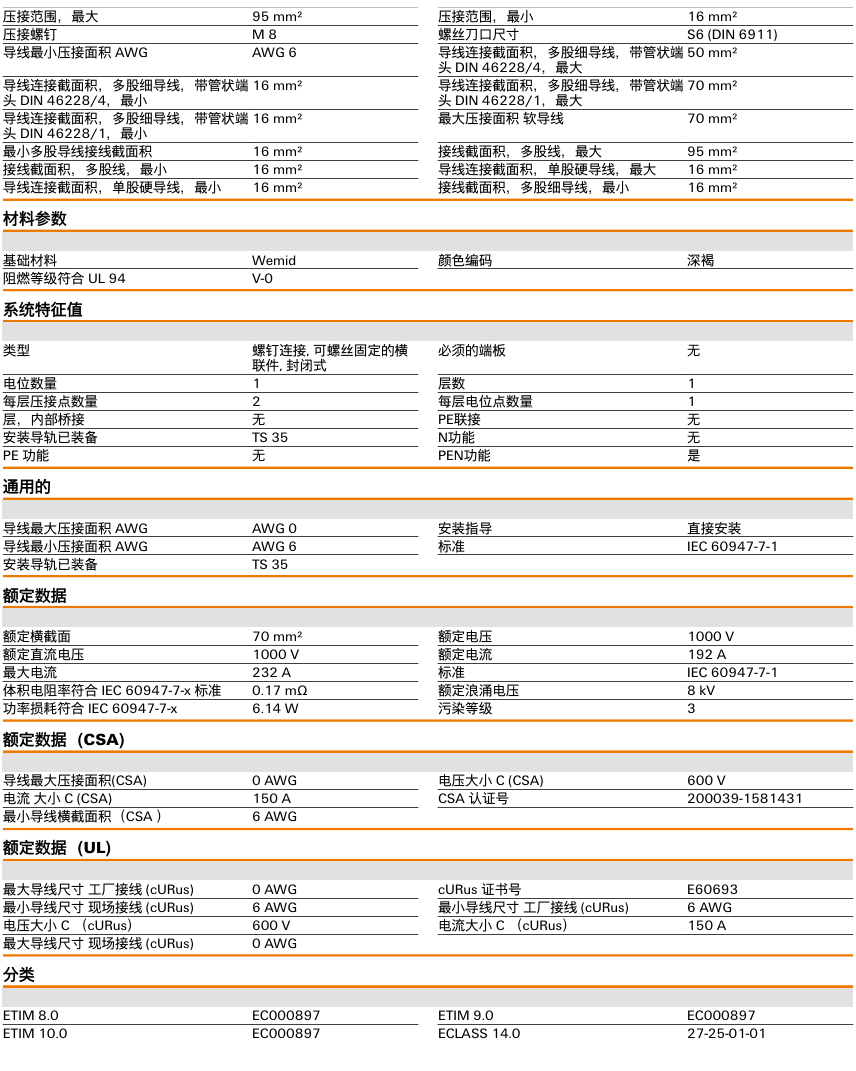 有关详细信息,请参阅产品样本及其他相关文件:直通型接线端子 | WDU 70N/35 | 9512190000、WDU 70N/35数据信息页